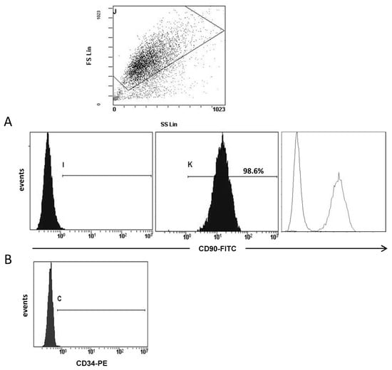 After enzymatic digestion, the suspension obtained was centrifuged at 400× g for 5 min. Cell pellet was resuspended and cultured in DMEM/F-12 supplemented with 10% FBS, 1% penicillin-streptomycin solution, 5 μg/mL insulin (Gibco), 1 μg/mL hydrocortisone (Sigma), and 5 ng/mL EGF (Invitrogen, Carlsbad, CA, USA). Cell cultures exhibited, predominantly, fibroblast morphology after three or four passages. Fibroblast culture purity was analyzed by flow-cytometry (Figure 1) using the antibody CD90 clone AS02 (Dianova, Hamburg, Germany) incubated at 1:50 (4 µg/mL) for 45 min. After, two washes with PBS 1X, cells were incubated with the secondary antibody (FITC, R & D Systems, Minneapolis, MN, USA, ref.: 0103) for 30 min. CD90 clone AS02 antibody specificity was confirmed by immunohistochemistry before being used on study samples [19]. Also, we analyzed the expression of CD34 (555822, BD Pharmingen, San Diego, CA, USA), which is expressed by hematopoietic stem cells/progenitors as well as by a multitude of other non-hematopoietic cell types, including epithelial progenitors and vascular endothelial progenitors.