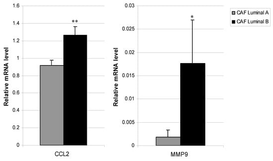 Real-time PCR analysis of factors assessed in CAFs from Luminal A and Luminal B breast cancer. Expression of CCL2 (left) and MMP9 (right). Data represent the mean ± SD (* p ≤ 0.05, ** p ≤ 0.001). For this analysis, performed in triplicate, all 19 patients were included.