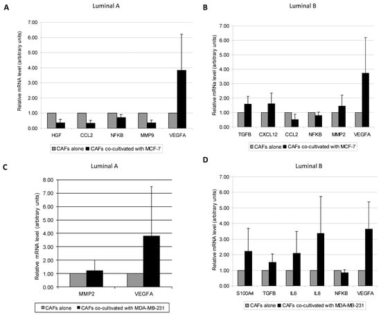 In the present study, we have investigated the gene expression of 19 factors implicated in tumor progression in CAFs from luminal breast carcinomas, and their variation after co-culture with MCF-7 and MDA-MB-231 breast cancer cell lines. Those factors were: the calcium-binding protein S100A4, several growth factors (FGF2, FGF7, HGF, PDGFA, PDGFB, TGFβ, VEGFA, and IGF2), and we also studied inflammatory cytokines (IL6 and IL8), chemokines (CCL2, CXCL12), important proteases (uPA, MMP2, MMP9, and MMP11), the nuclear factor NFκB, and the metalloprotease inhibitor TIMP1.