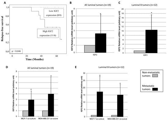We also compared the relapse-free survival period with the basal molecular profiling of CAFs. Six patients developed distant metastasis during the follow-up period: two patients with luminal A tumors and four with luminal B tumors. Then, we re-analyzed the gene expression of CAFs comparing those patients developing metastasis with the rest of patients. Interestingly, we found that high IGF2 gene expression (>median) in CAFs was significantly associated with a shortened relapse-free survival (Figure 4A). In addition, higher basal IGF2 gene expression was found in CAFs from metastasic tumors than in CAFs from non-metastasic tumors in all luminal tumors (Figure 4B), and especially, in luminal B tumors (Figure 4C). No significant data was obtained for luminal A tumors due to the low recurrence rate in this population and the small sample size. Finally, we also observed that higher IGF2 gene expression in CAFs from metastatic tumors remained increased after co-culture with MCF-7 or MDA-MB-231 (Figure 4D,E).