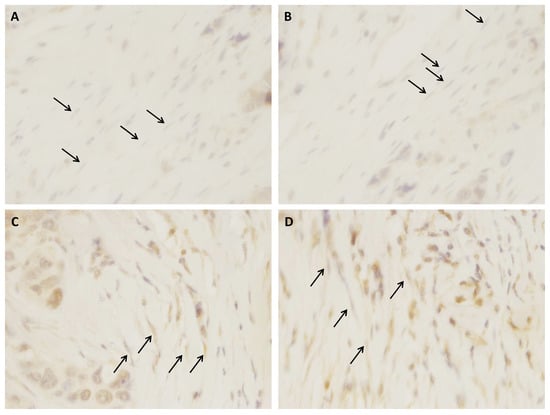Representative examples of IGF2 (A,B) negative and (C,D) positive immunostaining in fibroblasts, corresponding to (A,B) a non-metastatic and (C,D) a metastatic luminal B breast cancer, respectively (×400). Black arrows represent fibroblasts.