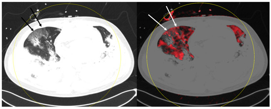 This example displays areas of ground glass opacities with perfusion defects (black arrow left lung) and ground glass opacities with normal perfusion (black arrow right lung).