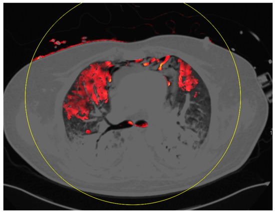 For a more detailed CT diagnosis, the implementation of dual-energy CT (DECT) allows the possibility of the creation of iodine maps. These maps can be used to quantify perfusion disorders within lung parenchyma—e.g., in pulmonary embolism or pulmonary hypertension [23,24,25,26,27,28]. In a previous study by Lang et al., possible pulmonary vascular manifestations of COVID-19 using DECT were demonstrated, including mosaic perfusion, regional hyperemia, as well as oligemia [29,30]. However, the exact extent and underlying pathophysiology of this phenomenon remain unclear.