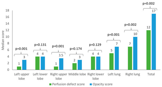 Due to the excellent inter-reader agreement, only the results of reader 1 are displayed in the following. The results of reader 2 are shown in Table 5. The left upper lobe showed significantly more visible opacities than perfusion defects in DECT imaging with a median of 3 (IQR 2–4) compared to 1 (IQR 1–4) (p = 0.001). Similar results were obtained for the right upper lobe with a median opacity score of 3.5 (IQR 3–4) compared to a median perfusion defect score of 1 (IQR 1–3) (p = 0.001). However, there was no significant difference regarding the lower lobes and the middle lobe. The left lower lobe was rated with a median opacity score of 4 (IQR 4–4) versus a median perfusion defect score of 4 (IQR 3–4) (p = 0.131). The middle lobe was rated with a median opacity score of 3 (IQR 1–4) compared to a median perfusion defect score of 2 (IQR 1–3) (p = 0.174). The right lower lobe was evaluated with a median opacity score of 4 (IQR 4–4) and a median perfusion defect score of 4 (3–4) (p = 0.129). The addition of the single lobe scores resulted in a median score of 5 (IQR 4–8) for perfusion defects of the left lung versus a median opacity score of 7 (IQR 6–8) (p = 0.001). The right lung resulted in a median perfusion defect score of 7 (IQR 5–11) compared to a median opacity score of 10 (IQR 8–11) (p = 0.002). In total, for both lungs the median perfusion defect score was 12 (IQR 9–18), versus the median opacity score of 17 (IQR 15–19) (p = 0.002). Figure 4 shows an analysis of the perfusion defects and opacities of reader 1. Figure 5 and Figure 6 display examples for different scores.