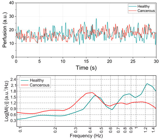 As for LDF, the evaluated amplitudes of the cardiac and respiratory oscillation were significantly higher in intact tissues (p < 0.001) compared to the cancerous ones, while the myogenic oscillation did not demonstrate any statistically significant difference. The results on the statistical analysis of the differences in the oscillations in normal intact and cancerous tissues are presented in Figure 6. The reason for the observed distinction of the amplitude values in the healthy and cancerous tissues can lie in the mechanical properties of the tumour resulting in the dimming of the amplitude of the pulse that propagates through the microvessels within the cancerous tissue.