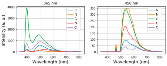 5 arbitrary fluorescence spectra and their labels obtained at the excitation channel of 365 nm (left) and 450 nm (right). In these graphs, the label “N” denotes a normal tissue whereas “C” a cancerous tissue.