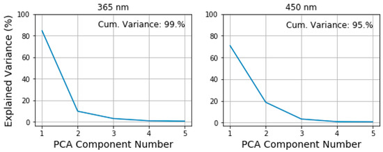Example of percentage of explained variance at the excitation channel of 365 nm (left) and 450 nm (right) achieved by PCA.