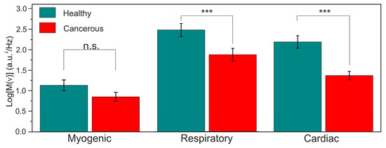 Results on the statistical analysis (One-Way ANOVA with Tukey’s post hoc test, *** p < 0.001, n.s.: not significant, Mean ± SE) of the differences in the oscillations in normal intact and cancerous tissues in the hepatoduodenal area.