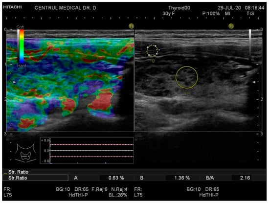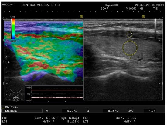 Therefore, in this prospective study, strain elastography was used in order to analyze the differences in the thyroid parenchyma elasticity of subjects diagnosed with chronic autoimmune thyroiditis compared with a healthy thyroid. Similar to current literature, our results showed significant differences between the average values of the strain ratio of patients with thyroiditis compared with the controls [25,33]. It has been shown that the level of stiffness of various diffuse thyroid pathologies can be ranked in ascending order as follows: control group < hyperthyroidism group < Hashimoto’s thyroiditis group < subacute thyroiditis group [25].