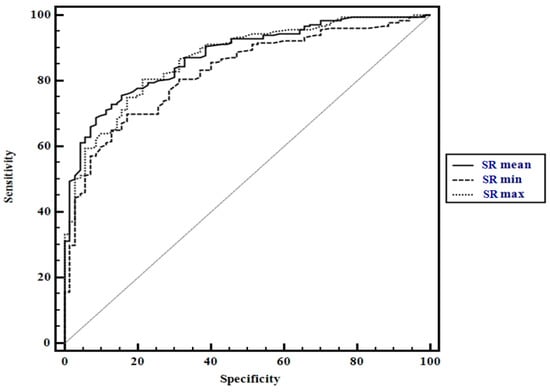 Comparison between receiver operating characteristic for SR values using mean SR values (SR mean), the highest SR values (SR max), and the lowest SR values (SR min).