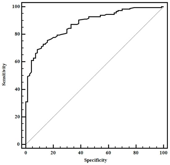 The mean thyroid stiffness values were significantly higher for patients with CAT compared with the healthy group (2.81 ± 2.11 vs. 1.03 ± 0.51; p < 0.0001).The optimal cut-off value (highest sum of sensitivity and specificity) for predicting the presence of CAT was >1.64 (AUROC 0.87, Sen 69%, Sp 92%, PPV 95.4%, NPV 54%) (Figure 4).