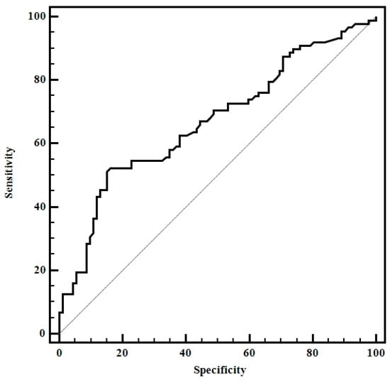 Out of the 180 patients diagnosed with CAT, 92 (51.1%) were already in the hypothyroidism phase, being on thyroid hormone replacement therapy at the time of examination. Mean thyroid stiffness values were significantly higher for patients with hypothyroidism compared with those with an asymptomatic disease (3.45 ± 2.53 vs. 2.15 ± 1.27, p < 0.0001). An optimal cut-off value (highest sum of SE and SP) of > 2.94 was established for predicting the presence of hypothyroid status in the case of CAT patients with Sen (52.3%), Sp (83.7%), PPV (75.4%), NPV (64.7%) and AUROC (0.66) (Figure 5).