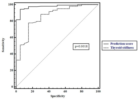 Comparison between receiver operating characteristics for thyroid stiffness values and the prediction score.