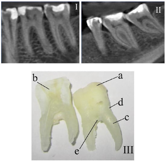 The fragments of teeth following computed tomography that were (I) healthy and (II) diagnosed with periodontitis. (III) Photo of a tooth with the researched areas indicated: a—enamel, b—dentin, c—cementum, d—above-gum dental calculus, and e—under-gum dental calculus.