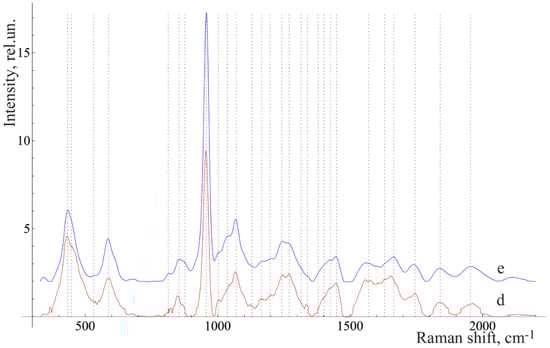 The average Raman spectra, normalized to the average intensity of the studied samples. d—above-gum dental calculus and e—under-gum dental calculus.