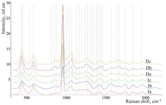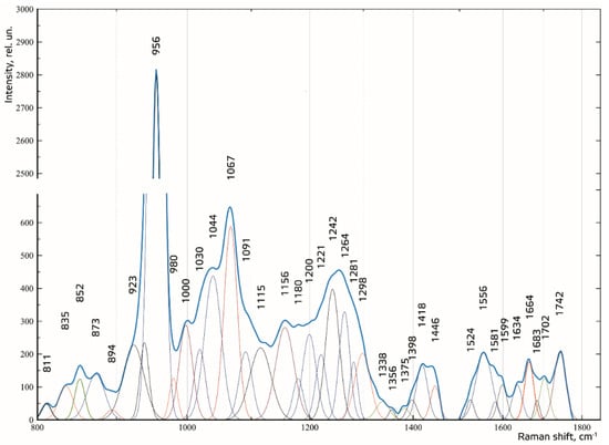 The composition of the spectral lines was determined by literature analysis and multi-iteration modeling of 392 Raman spectra using MagicPlotPro 2.5.1 software. When modeling the spectral contours at the lines used as a template, the position x0 and the width of the line (HWHM—half width at half) dx were fixed. Only the intensity of the line was selected when modeling. This allowed us to achieve highly stable results when modeling the contours. The amplitude of the lines a, which depended on the values of the independent regressors dx and x0, as defined in the initial terms of the analysis, was used as a criterion variable.