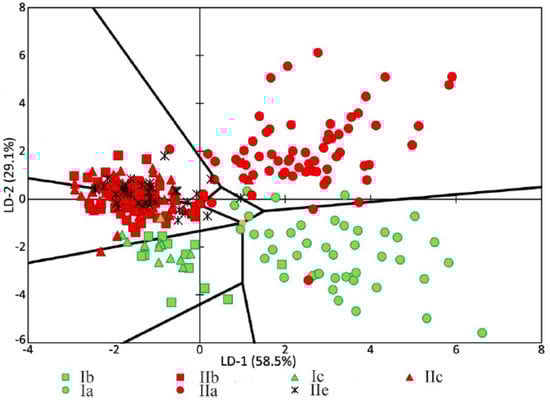 Figure 9 shows the coefficients of the factor structure matrix, with a correlation between the variables in the model and the discriminant function. In the analysis, these correlation coefficients were considered to be the factor loadings of the variables for each discriminant function.