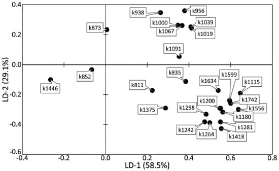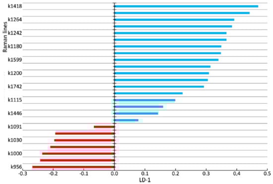 The higher the absolute value of LD-1 for the variable is, the more strongly it determined the difference between the groups of samples in the received model of discriminant analysis. For example, the values of the introduced coefficients k873, k956, k1000, k1039, k1044, k1067, and k1091 were higher in the group of enamel samples with periodontitis, which indicates an increase in the relative intensity of the corresponding lines in tissue with periodontitis.