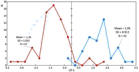 Chart of the linear discriminant function values of the enamel samples. The red line is the enamel of teeth with periodontitis (damaged enamel), and the blue line is the enamel of healthy teeth.