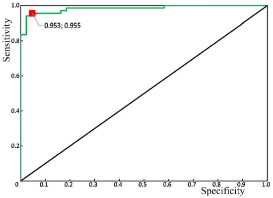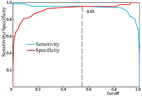 Figure 10 shows the results of the receiver operator characteristic (ROC) analysis of the developed algorithm for diagnosing periodontitis. The discriminant adequacy of the method had an area under the curve (AUC) value of 0.983, which indicates the great quality of the diagnostic tool. The standard error (SE) was 0.01, and the 95% confidence interval of the AUC was in the range of 0.963–1. The optimal cut-off point for the presented algorithm, determined according to the condition of balance between sensitivity and specificity, was 0.55 (Figure 11). The values of sensitivity and specificity for the diagnostic model at that cut-off point were 95.5% and 95.3%, respectively.