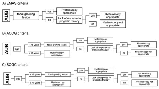 All patients were evaluated based on three algorithms set up according to the criteria of three different guidelines of scientific societies, which are: (A) the “EMAS clinical guide: assessment of the endometrium in peri e postmenopausal women” of the European Menopause and Andropause Society (EMAS); (B) the “Diagnosis of AUB in reproductive-aged women” of the American Congress of Obstetricians and Gynecologists (ACOG); and (C) the “AUB in premenopausal women” of the Society of Obstetricians and Gynecologists of Canada (SOGC) [12,16,17]. The EMAS algorithm considers hysteroscopy as appropriate if there is a focal growing lesion or in the case of lack of response to the progestin therapy. ACOG and SOGC guidelines add the patient’s age as an independent risk factor: ACOG considers hysteroscopy appropriate for every patient with AUB and ≥ 45 years old, whereas SOGC puts the cut off at ≥ 40 years of age [12,16,17]. Differences between the three algorithms used to define the need for endometrial biopsy are highlighted in Figure 1.