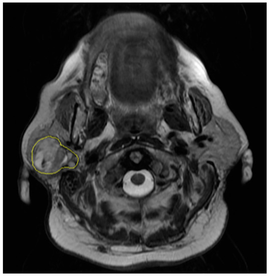 Segmentation of axial T2-weighted magnetic resonance (MR) image of a 61-year-old woman with a pleomorphic adenoma of the right parotid gland.