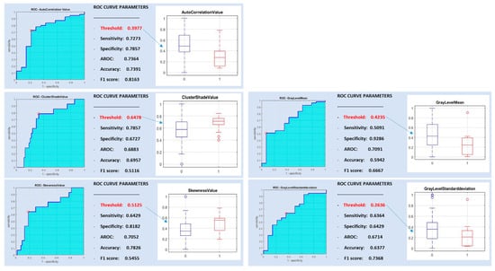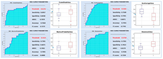 Both features (cluster prominence value and sum of square variance value) had a sensitivity of 0.7391, whereas they showed a specificity of 0.7143 and 0.6429 and a diagnostic accuracy of 0.7143 and 0.7112, respectively (Figure 5).