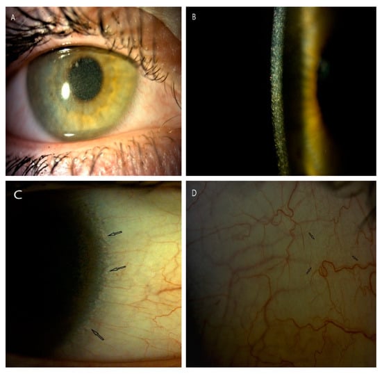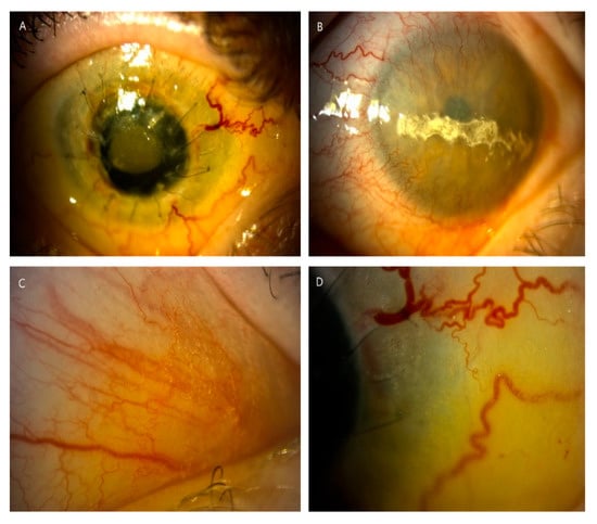 Slit-lamp photographs (10–25×) displayed complications of the anterior segment in long-term nephropathic cystinosis with delayed treatment (patient 6). (A) Cornea after two unsuccessful keratoplasties with hazy transplant, ingrown vessels, loose sutures and hyperemia of conjunctiva in the right eye. (B) Band keratopathy and significant peripheral corneal neovascularization in the left eye. (C,D) Significant density of crystal deposits in conjunctiva, in places blurring the drawing of the vessels.