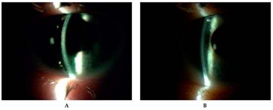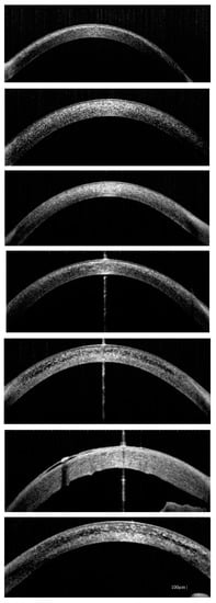 Ocular involvement is the first extrarenal symptom of cystinosis []. Depositions of cystine crystals in the cornea and conjunctiva are pathognomonic symptoms of the condition []. Data from the literature report accumulation of cystine deposits in the iris, ciliary body, choroid, retina and optic nerve too []. Only one (P7) out of the seven studied patients presented cystine crystals not only in the cornea and conjunctiva but also in iris. Our findings showed crystal deposition within not only the anterior stroma but also deeper, covering the entire cornea depth-wise. Locations in anterior stroma were observed in patients with juvenile cystinosis and in the youngest patients. Labbe et al. reported a mean depth of 291.4 µm []. A previous study has reported the appearance of cystine crystals mainly within the anterior stroma []. Our study demonstrated that AS-OCT is a non-invasive method that can be used easily, even in very young patients, and it is very useful to visualize cystine crystals. However, any ocular surface complications occurring, such as scars, band keratopathy, bullous keratopathy, etc., are a limitation in the evaluation of crystal location.
