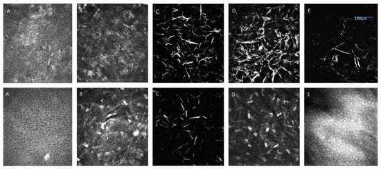 Presentation of cystine crystals in in vivo confocal microscope (IVCM) images over a 400 × 400 µm area. On the top, significantly greater accumulation of cystine deposits in patient P3 with infantile cystinosis compared to (below) patient P4 with juvenile cystinosis. (A) Epithelium, (B) Bowman layer, (C) anterior stroma, (D) deep stroma, (E) endothelium. Additionally, panel A shows intracellular (IC) and extracellular (EC) crystals in the epithelium layer.