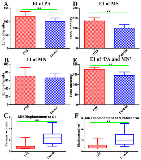 Echo intensity of the paraneural area at the carpal tunnel (A). Echo intensity of the median nerve at the carpal tunnel (B). Median nerve displacement at the carpal tunnel (C). Echo intensity of myofascial structure around the median nerve (1 cm2) at the mid-forearm (D). Echo intensity of the paraneural area and median nerve at the mid-forearm (E). Median nerve displacement at the mid-forearm (F). EI: echo intensity, PA: paraneural area, MN: median nerve, CT: carpal tunnel, MS: myofascial structure, CTS: carpal tunnel syndrome, ** Difference between groups is statistically significant (p < 0.01).