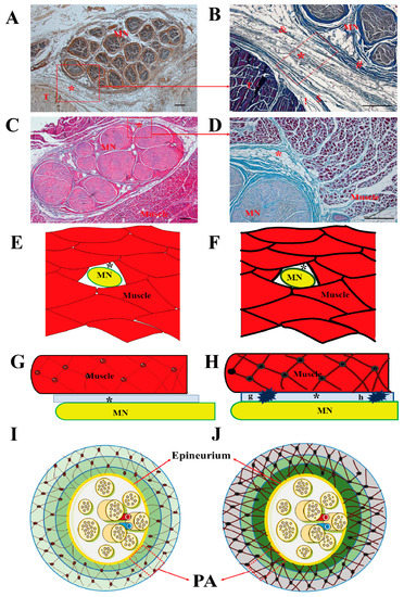 MN and surrounding tissue. Samples stained with S100 antibody (A), hematoxylin and eosin (C), Azan Mallory Trichrome (B,D). (E,F,G,H): Sketch of median nerve and myofascial structure in cross (E,F) and longitudinal section (G,H). Normal myofascial structure in control subjects (E,G). Disruption of myofascial structure architecture in CTS (F,H). Compression points of MN (G,H). Sketch of median nerve and paraneural area (PA) (I,J). Normal paraneural area in healthy controls (I). The disruption of the paraneural area’s architecture in CTS (J). MN: median nerve, T: tendon, *: paraneural area, !: epitenon, $: paratenon: &: paraneural sheath, #: epineurium, Scale bar: 100 μm.