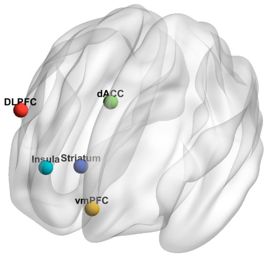 Graphical representation of seed locations. DLPFC, dorsolateral prefrontal cortex (red). vmPFC, ventromedial prefrontal cortex (yellow). dACC, dorsal anterior cingulate cortex (green). Insula (light blue). Striatum (dark blue).