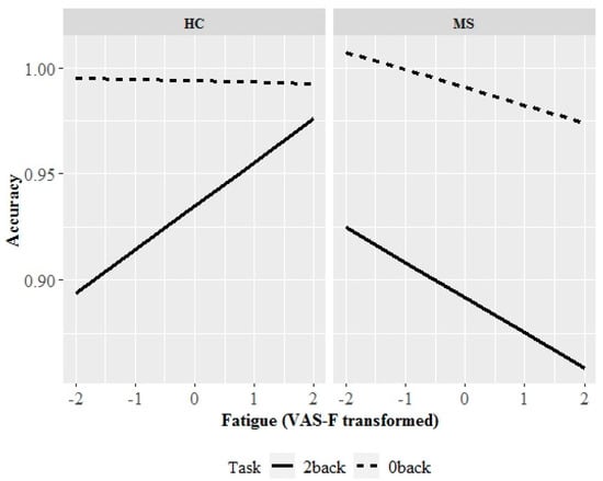 Group × condition × VAS-F (transformed) interaction for n-back task accuracy. For the 2-back condition, there was a positive correlation between fatigue levels and accuracy in the HC group and a negative correlation in the MS group. There were no significant relationships between fatigue levels and accuracy for the 0-back condition. 0-back condition is denoted by dotted lines, and the 2-back condition is denoted by solid lines. Abbreviations: MS, multiple sclerosis. HC, healthy control. VAS-F, Visual Analogue Scale of Fatigue.