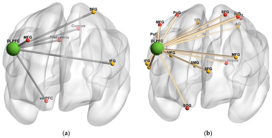 Dorsolateral prefrontal cortex connectivity 3-dimensional rendering. (a) Task-independent, fatigue-related connectivity in the healthy control group; (b) Task-independent, fatigue-related connectivity in the multiple sclerosis group. The seed is denoted by green spheres; regions with increased connectivity to the seed in the 2-back condition are denoted by yellow spheres, and regions with increased connectivity to the seed in the 0-back condition are denoted by red spheres. Cerebellar regions were omitted. Anterior orientation is in the front of the figure; right hemisphere is on the left side, and left hemisphere is on the right side. Abbreviations: SFG, superior frontal gyrus. MFG, middle frontal gyrus. IFG, inferior frontal gyrus. vmPFC, ventromedial prefrontal cortex. SMG, superior medial gyrus. PrG, precentral gyrus. PoG, postcentral gyrus. SOG, superior orbital gyrus. SPL, superior parietal lobule. AG, angular gyrus.