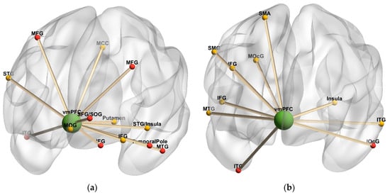 Ventromedial prefrontal cortex connectivity 3-dimensional rendering. (a) Task-independent, fatigue-related connectivity in the healthy control group. (b) Task-independent, fatigue-related connectivity in the multiple sclerosis group. The seed is denoted by green spheres; regions with increased connectivity to the seed in the 2-back condition are denoted by yellow spheres, and regions with increased connectivity to the seed in the 0-back condition are denoted by red spheres. Cerebellar regions were omitted. Anterior orientation is in the front of the figure; right hemisphere is on the left side, and left hemisphere is on the right side. Abbreviations: SFG, superior frontal gyrus. MFG, middle frontal gyrus. IFG, inferior frontal gyrus. vmPFC, ventromedial prefrontal cortex. MCC, middle cingulate cortex. SMA, supplementary motor area. SOG, superior orbital gyrus. MOG, middle orbital gyrus. SMG, supramarginal gyrus. STG, superior temporal gyrus. MTG, middle temporal gyrus. ITG, inferior temporal gyrus. MOcG, middle occipital gyrus. IOcG, inferior occipital gyrus.