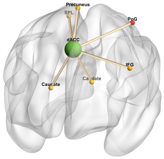 Dorsal anterior cingulate cortex connectivity 3-dimensional rendering. Figure represents task-independent, fatigue-related connectivity in the multiple sclerosis group; there were no significant differences between conditions in the healthy control group. The seed is denoted by a green sphere; regions with increased connectivity to the seed in the 2-back condition are denoted by yellow spheres, and regions with increased connectivity to the seed in the 0-back condition are denoted by red spheres. Cerebellum was omitted. Anterior orientation is in the front of the figure, right hemisphere is on the left side, and left hemisphere is on the right side. Abbreviations: dACC, dorsal anterior cingulate cortex. IFG, inferior frontal gyrus. PoG, postcentral gyrus. SPL, superior parietal lobule.