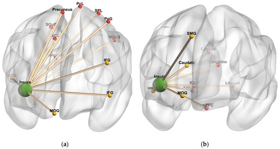 Insula connectivity 3-dimensional rendering. (a) Task-independent, fatigue-related connectivity in the healthy control group. (b) Task-independent, fatigue-related connectivity in the multiple sclerosis group. The seed is denoted by green spheres; regions with increased connectivity to the seed in the 2-back condition are denoted by yellow spheres, and regions with increased connectivity to the seed in the 0-back condition are denoted by red spheres. Cerebellar regions were omitted. Anterior orientation is in the front of the figure; right hemisphere is on the left side, and left hemisphere is on the right side. Abbreviations: IFG, inferior frontal gyrus. vmPFC, ventromedial prefrontal cortex. SMG, superior medial gyrus. MCC, middle cingulate cortex. PcL, paracentral lobule. PoG, postcentral gyrus. MOG, middle orbital gyrus. STG, superior temporal gyrus. SPL, superior parietal lobule. SOcG, superior occipital gyrus. MOcG, middle occipital gyrus. IOcG, inferior occipital gyrus.