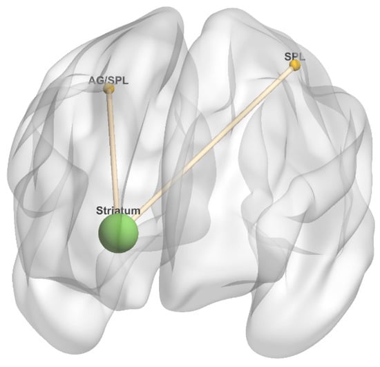 Striatum connectivity 3-dimensional rendering. Figure represents task-independent, fatigue-related connectivity in the multiple sclerosis group; there were no significant differences between conditions in the healthy control group. The seed is denoted by a green sphere, and regions with increased connectivity to the seed in the 2-back condition are denoted by yellow spheres; there were no regions with increased connectivity to the seed in the 0-back condition. Anterior orientation is in the front of the figure; right hemisphere is on the left side, and left hemisphere is on the right side. Abbreviations: SPL, superior parietal lobule. AG, angular gyrus.