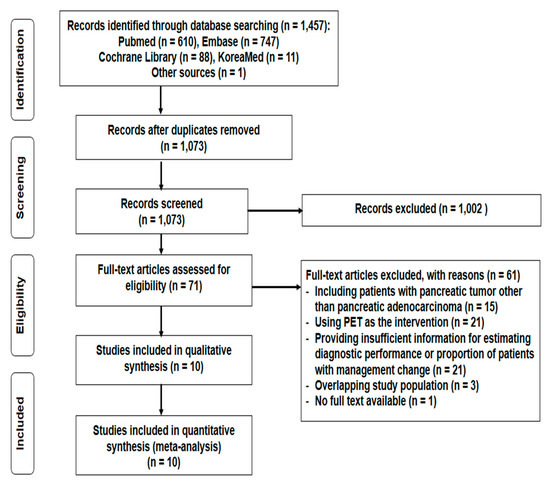 All relevant literature underwent evaluation for eligibility according to inclusion criteria based on the patient/intervention/comparator/outcome/study (PICOS) approach [20], as follows: (1) individuals with newly diagnosed pancreatic ductal adenocarcinoma as the patients; (2) FDG PET/CT or PET/MRI as the intervention; (3) no comparator; (4) the diagnostic performance for staging pancreatic cancer, confirmed by histopathological evaluation or imaging studies, and the proportion of patients with management changes as the outcomes; and (5) original articles as the study type. The exclusion criteria were as follows: studies that (1) enrolled any patients with malignant pancreatic diseases other than pancreatic ductal adenocarcinoma, such as neuroendocrine tumors, metastasis, or lymphoma; (2) used PET, not PET/CT, or PET/MRI as the intervention; (3) provided insufficient information for calculating true-positive, false-positive, true-negative, and false-negative rates for estimating diagnostic performance during per-patient analysis or for calculating the proportion of patients with management changes; (4) were publication types other than original articles, including case reports, reviews, letters, editorials, and conference abstracts; (5) were in vitro or animal studies; (6) had study populations that overlapped with other literature; (7) were published in languages other than English or Korean; or (8) were not available in full text.