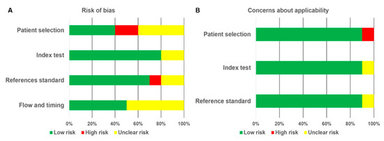 Quality assessment of 10 included studies using the QUADAS-2 tool to evaluate the risk of bias (A) and concerns about applicability (B). Each diagram shows the percentage of studies with low (green), high (red), and unclear (yellow) risk of bias.