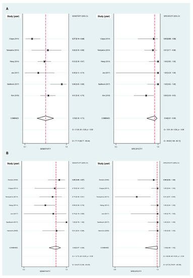 Forest plots of the pooled sensitivity and specificity for detecting lymph node metastasis (A) and for detecting distant metastasis (B), with 95% confidence intervals. Each solid square represents the sensitivity and specificity of each of the included studies, and the diamond indicates the pooled sensitivity and specificity.