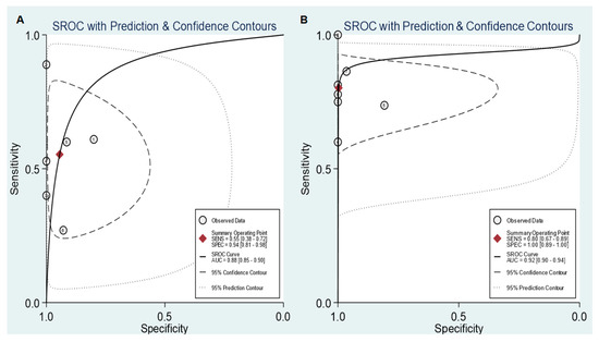 Seven studies with a total of 296 patients provided data regarding the diagnostic ability of FDG PET/CT and PET/MRI for detecting distant metastasis [6,12,13,14,23,25,26]. The pooled sensitivity and specificity of FDG PET/CT and PET/MRI for diagnosing distant metastasis were 0.80 (95% CI: 0.67–0.89) and 1.00 (95% CI: 0.89–1.00), respectively (Figure 3B). The pooled PLR, NLR, and DOR were 215.30 (95% CI: 7.39–6273.09), 0.20 (95% CI: 0.12–0.34), and 1084.20 (95% CI: 33.92–34,658.01), respectively, with an AUC of SROC of 0.92 (95% CI: 0.90–0.94; Figure 4B). The study which evaluated PET/MRI [23] found a sensitivity and specificity of 0.75 (95% CI: 0.19–0.99) and 1.00 (95% CI: 0.75–1.00), respectively, for detecting distant metastasis, which were similar to the results of other studies evaluating PET/CT.