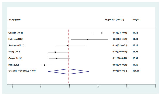Six studies with a total of 650 patients assessed the proportions of patients who underwent management changes following FDG PET/CT staging and compared it to that of conventional staging [6,11,12,13,14,15]. All six studies performed PET/CT for initial staging of pancreatic cancer. The pooled percentage of patients who underwent management changes following FDG PET/CT was 19% (95% CI: 5–34%, Figure 5). In all six studies, the most common reason of management change was identifying unknown metastatic lesions by PET/CT. Additionally, PET/CT also changed the management plan by detecting secondary primary malignancies and ruling out metastasis of lesions found on other imaging modalities.
