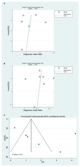 There was substantial heterogeneity in the sensitivity for lymph node metastasis (p < 0.001; I2 = 77.1; 95% CI: 58.8–95.4%; Figure 3A), the specificity for distant metastasis (p < 0.001; I2 = 87.5; 95% CI: 79.7–95.4%; Figure 3B), and the proportion of patients who underwent management changes following FDG PET/CT staging ((p < 0.001; I2 = 96.3; 95% CI: 91.1–98.7%; Figure 5) among the included studies. The specificity for lymph node metastasis (p = 0.08; I2 = 49.1%; 95% CI: 2.0–96.1%; Figure 3A) and the sensitivity for distant metastasis (p = 0.05; I2 = 52.9%; 95% CI: 12.7–93.1%; Figure 3B) showed borderline significance with regard to the I2 statistic. No significant publication bias was shown for all meta-analyses in the current study (p = 0.80 for diagnostic ability in detecting lymph node metastasis; p = 0.81 for diagnostic ability in detecting distant metastasis; p = 0.31 for proportion of patients who underwent management changes; Figure 6).