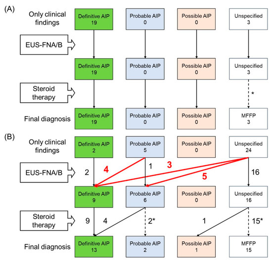 Diagnostic flow of autoimmune pancreatitis according to Japanese Clinical Diagnostic Criteria for Autoimmune Pancreatitis 2018 in patients with diffuse enlargement of the pancreas (A) and in those with focal enlargement (B). AIP, autoimmune pancreatitis; EUS-FNA/B, endoscopic ultrasonography-guided fine needle aspiration/biopsy; MFFP, mass-forming focal pancreatitis. * They did not receive steroid therapy.