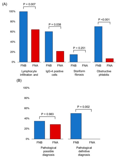 Comparison of the diagnostic yield of EUS-FNA/B among patients with probable and definitive AIP. (A) Comparison of the sensitivity for each typical histological finding of lymphoplasmacytic sclerosing pancreatitis. (B) Comparison of the sensitivity for pathological diagnosis. AIP, autoimmune pancreatitis; EUS-FNA/B, endoscopic ultrasonography-guided fine needle aspiration/biopsy.