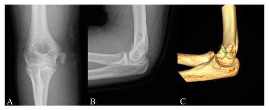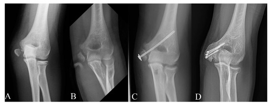 - Kulkarni, V.S.; Arora, N.; Gehlot, H.; Saxena, S.; Kulkarni, S.G.; Bajwa, S. Symptomatic medial humeral epicondylar fracture non-union- rare presentation of a relatively common injury. Injury 2017, 48 (Suppl. 2), S50–S53. [Google Scholar] [CrossRef]
