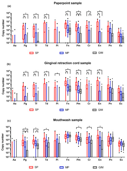 Quantitative profiles of target bacteria. DNA copy numbers are reported on a log10 scale. DNA copy numbers are plotted with box and whisker plot, indicating interquartile range and 5–95 percentile, respectively. All comparisons were conducted with Kruskal–Wallis H test and Bonferroni correction. Adjusted p-value = 0.0167. (a) Bacterial profile in the paperpoint samples; (b) Bacterial profile in the gingival retraction cord samples; (c) Bacterial profile in the mouthwash samples. SP: severe periodontitis, MP: moderate periodontitis, G/M: gingivitis/mild periodontitis.