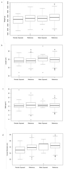 Comparisons between the values of anthropometry in the sample of the study and the reference population did not demonstrate significant statistically differences on weight (p = 0.1233), length (p = 0.1582), BMI (p = 0.94860) and cranial perimeter (p = 0.06608) due to ARFE fetal exposure (Figure 2). Anthropometric Z-scores for length, weight, BMI, and cranial perimeter showed normal values (<−1 SD) both in females and males newborns in the study in relation to the gendered reference population. The mean of weight, BMI, and cranial perimeter in both sexes in the subjects of the study were below the mean in the reference population, whereas the mean of length was higher (<+1 SD). Therefore, percentiles of weight, BMI, and cranial perimeter were lower than percentiles of length ( versus ) both in males and females of the study referred to the WHO population (Table 4).